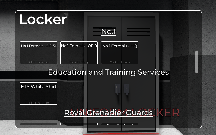 A modular locker system with morphs that can only be worn by certain ranks in a certain group.