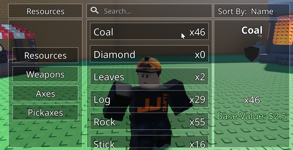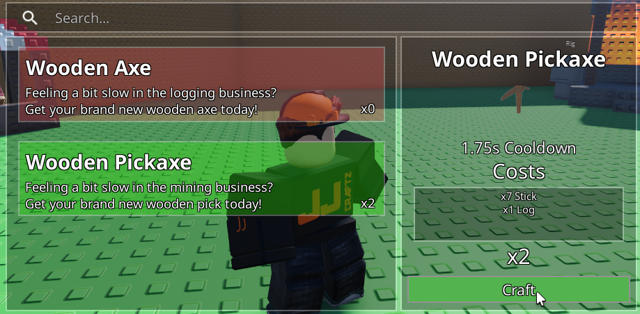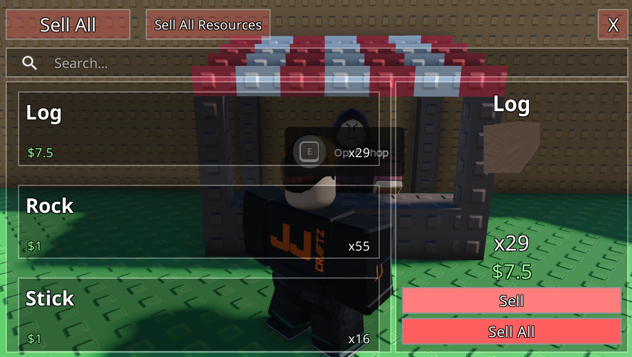 A variety of survival systems including: mining, inventory, crafting, selling/buying, money, XP and more.
